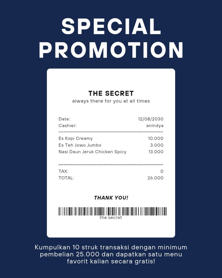 Belanja sambil nabung hadiah? Bisa banget! 🧾💙Kumpulkan 10 struk min. pembelian 25K dan tukarkan dengan menu gratis dari The Secret!Yuk kumpulin dari sekarang, jangan sampai kelewatan! ✨